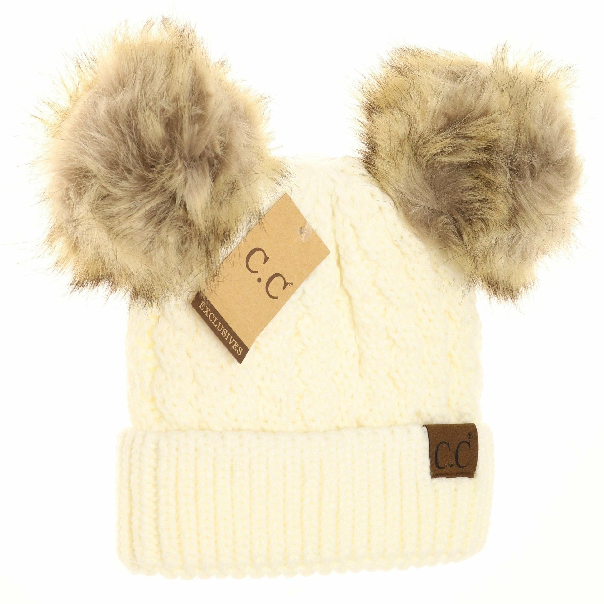 THIS is the beanie hat you have been waiting for! It is soft, fun and flirty for your fall and winter activities! A cable knit with a faux fur double pom!