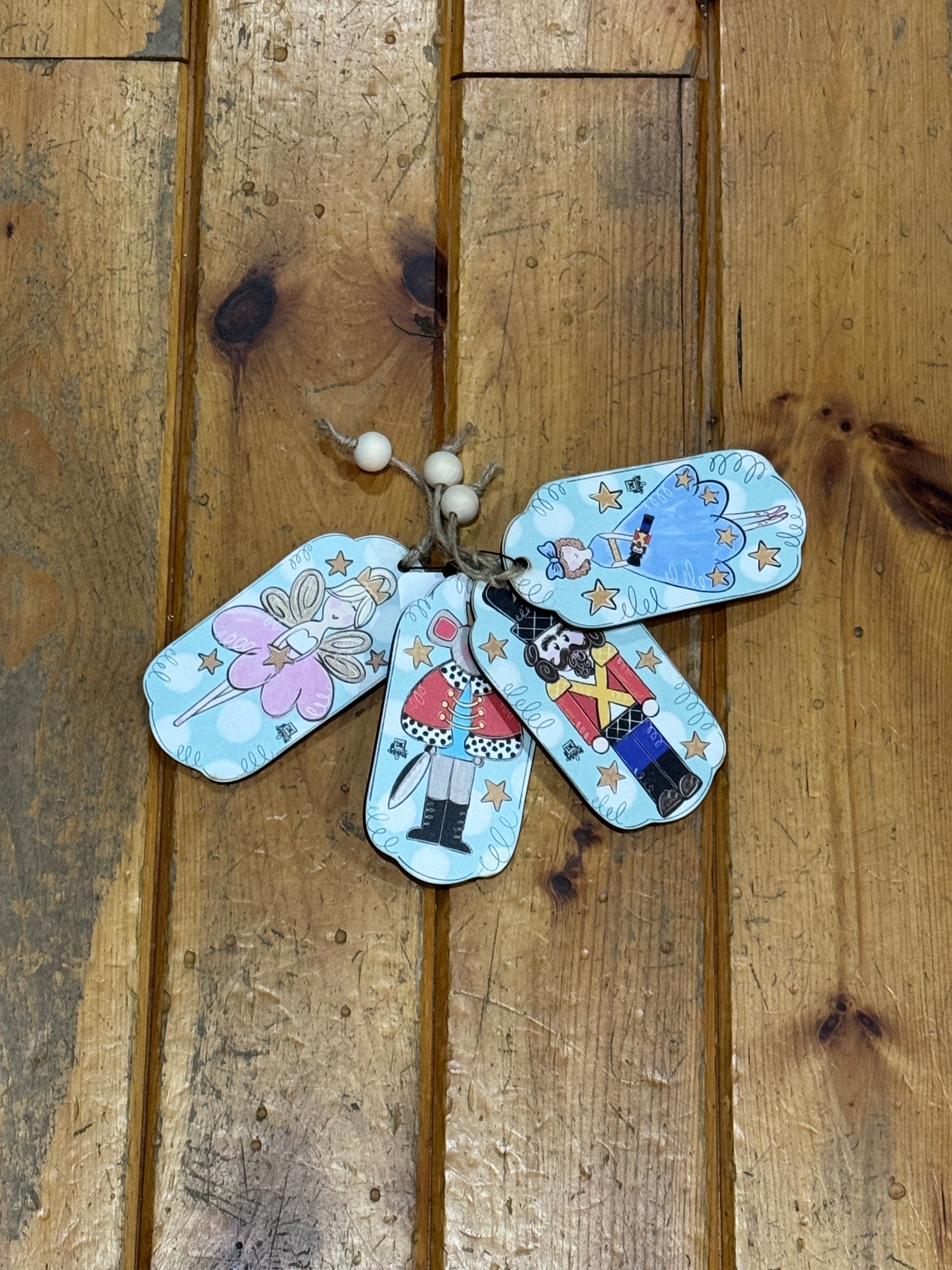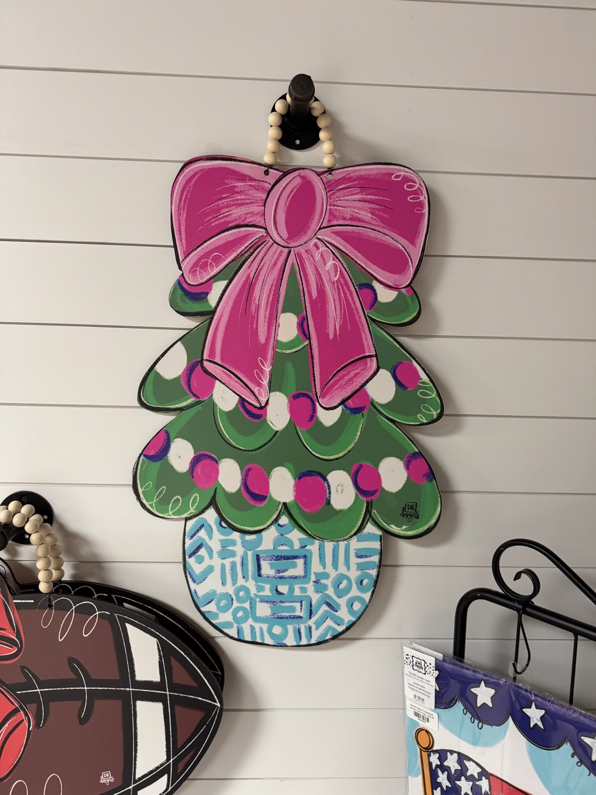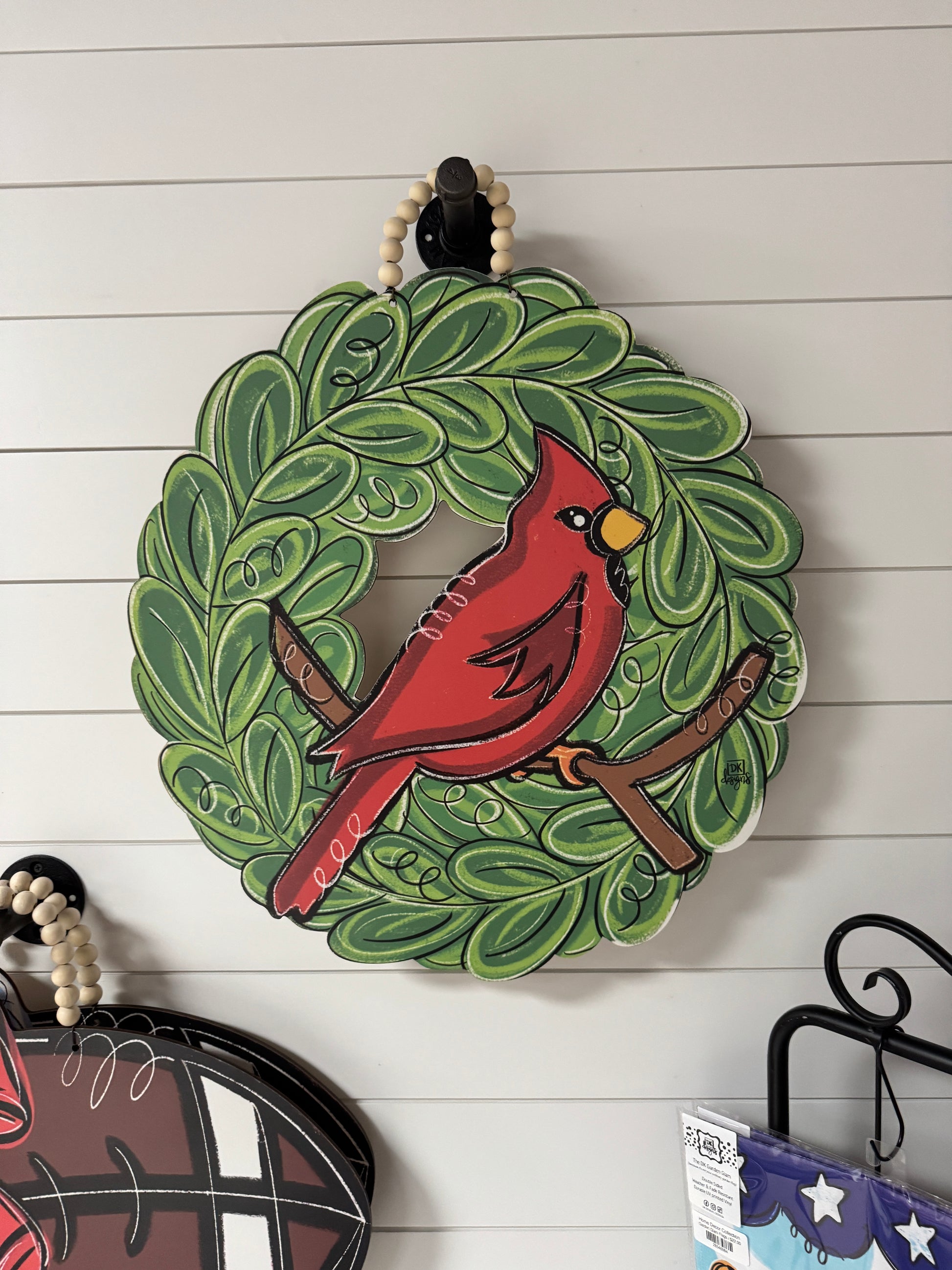Perfect for indoor or outdoor use. All original designs are printed on a moisture resistant high quality 1/4" board and sealed for additional protection with 2 coats of a gloss finish. DK hangers come with a fully wired beaded handle.